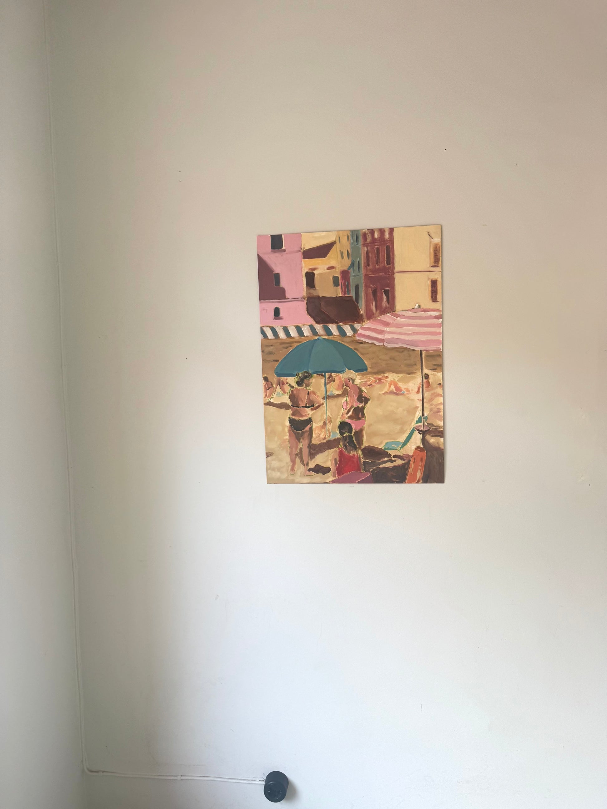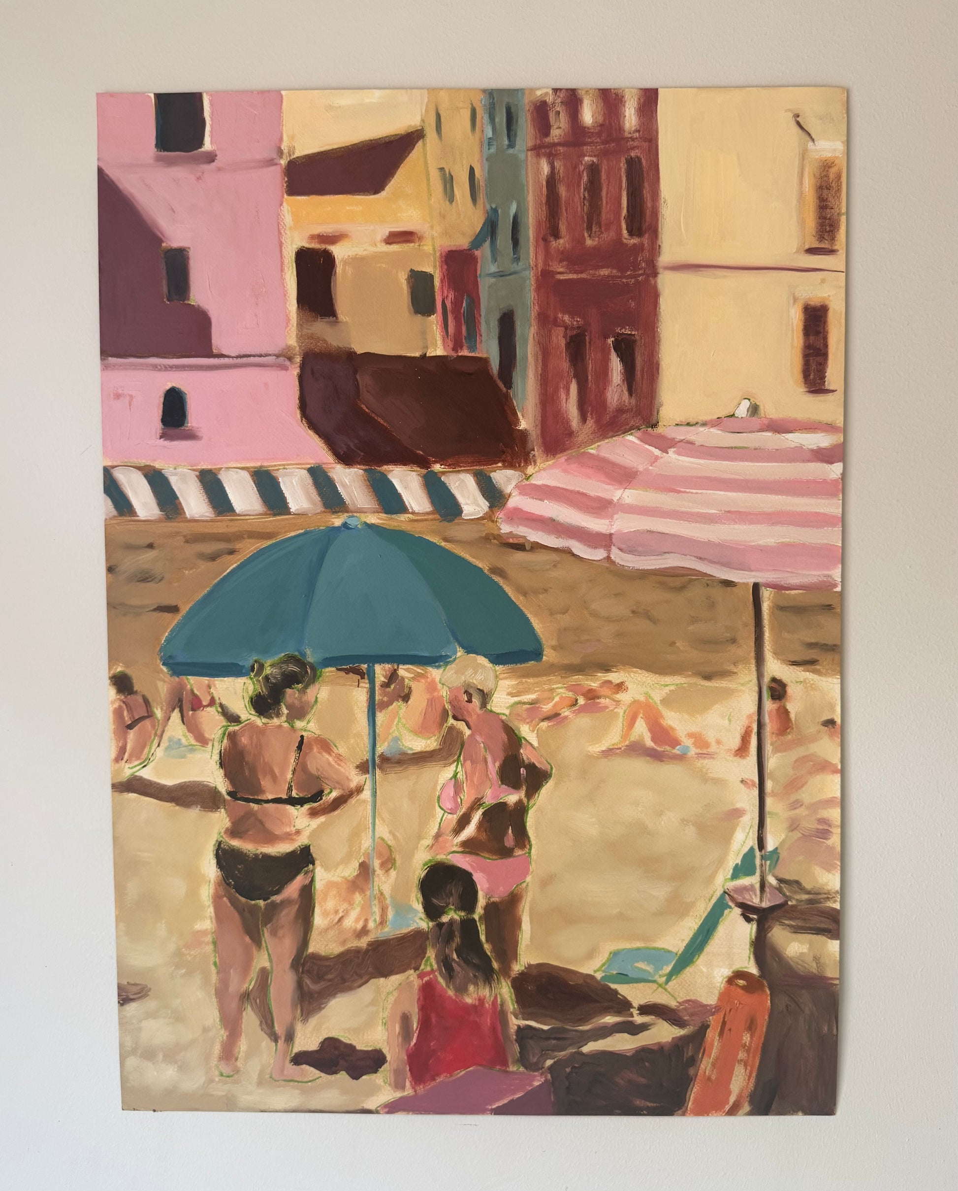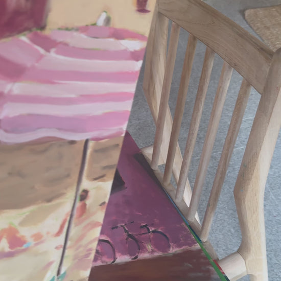 Inspired by holiday snapshots, this piece captures everyday moments with a playful touch. It features two ladies sharing a chat in the cool shade of the beach, frozen in time from my casual wanderings.