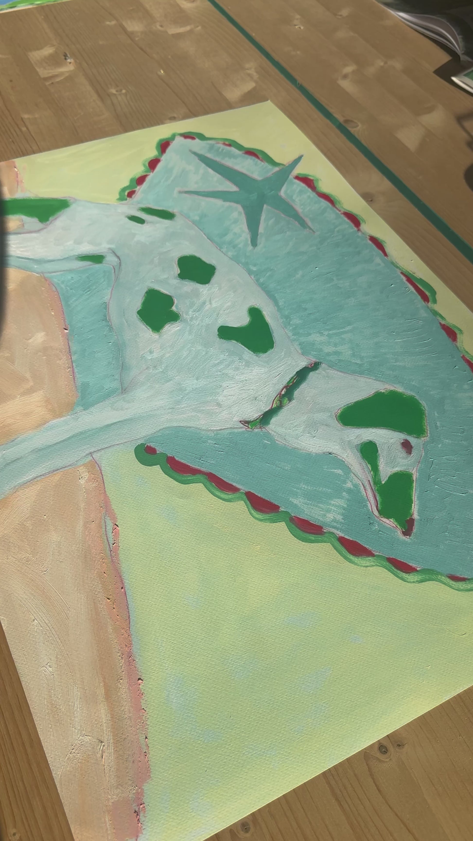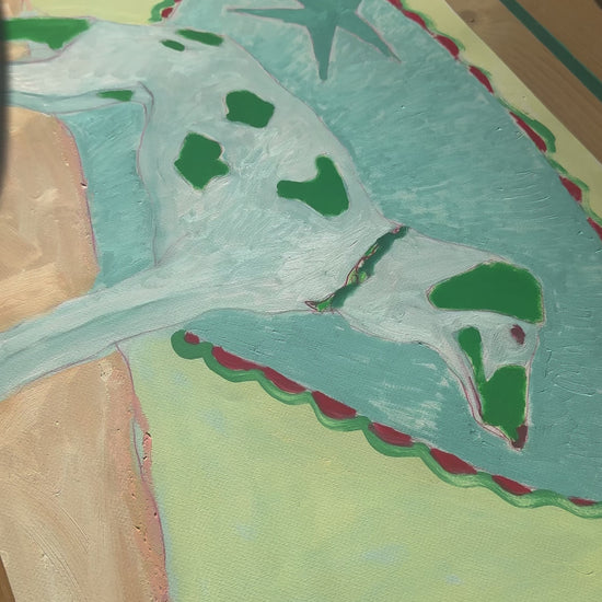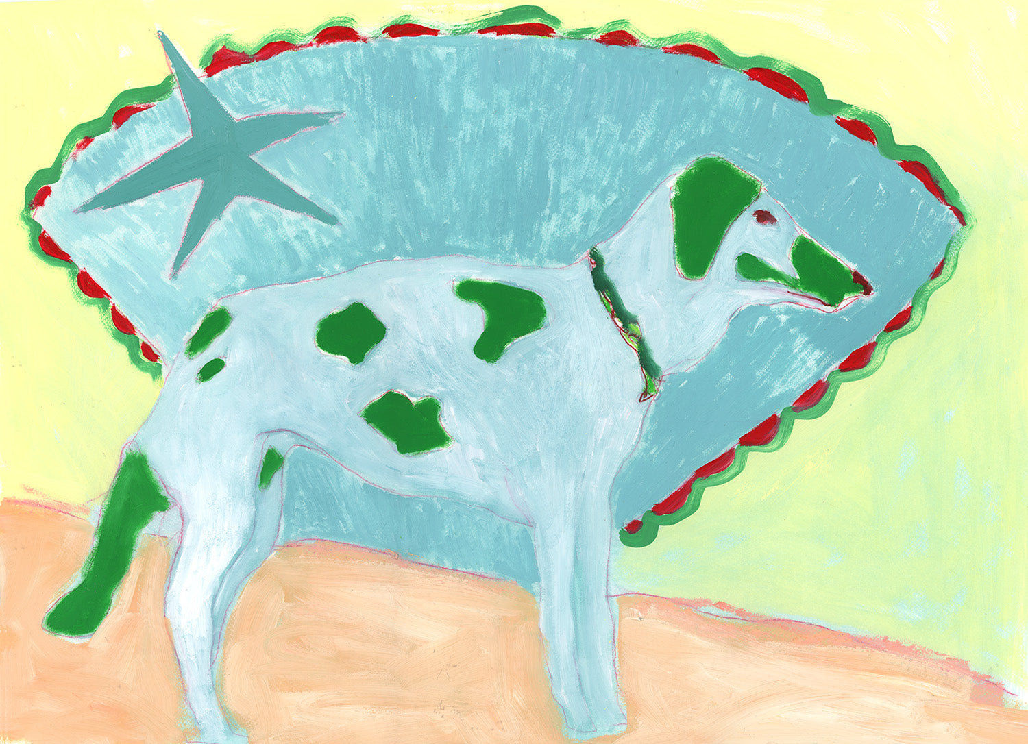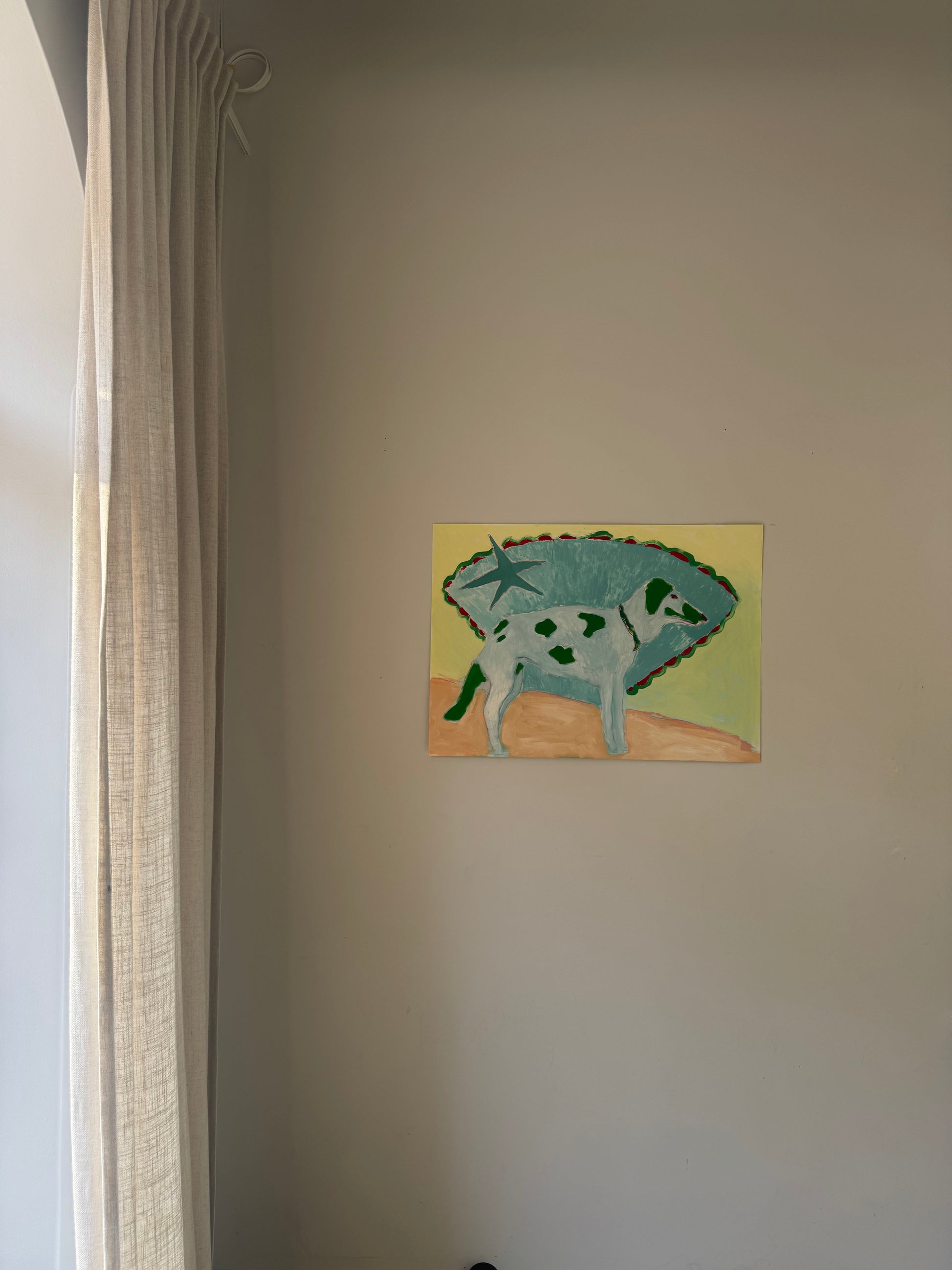 Based on a small series of dog images I have taken on my walk to the studio. I have used bright block colours and shape to add a playful nature.